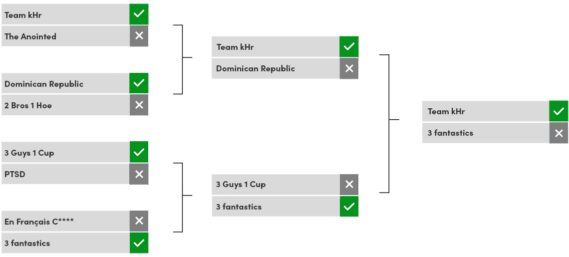 | The Unclutchables | 0 | 3 | 0 | 0 |